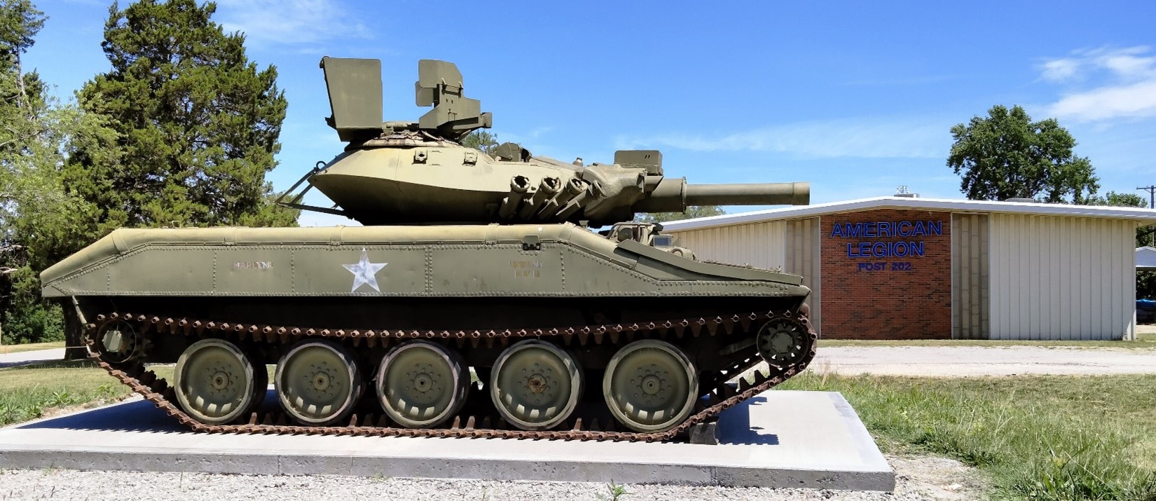 American Legion Post 202 had applied several times over the years for a "static display" from the military hoping for a cannon, a Huey helicopter, anything that would attract attention to our Post. Finally in May of 2022 we received a letter from U. S. Army TACOM that a tank was available in Kansas if we wanted it. We had just two weeks to give them an answer. The tank was at the Kansas Museum of Military History near Wichita that had gone out of business.